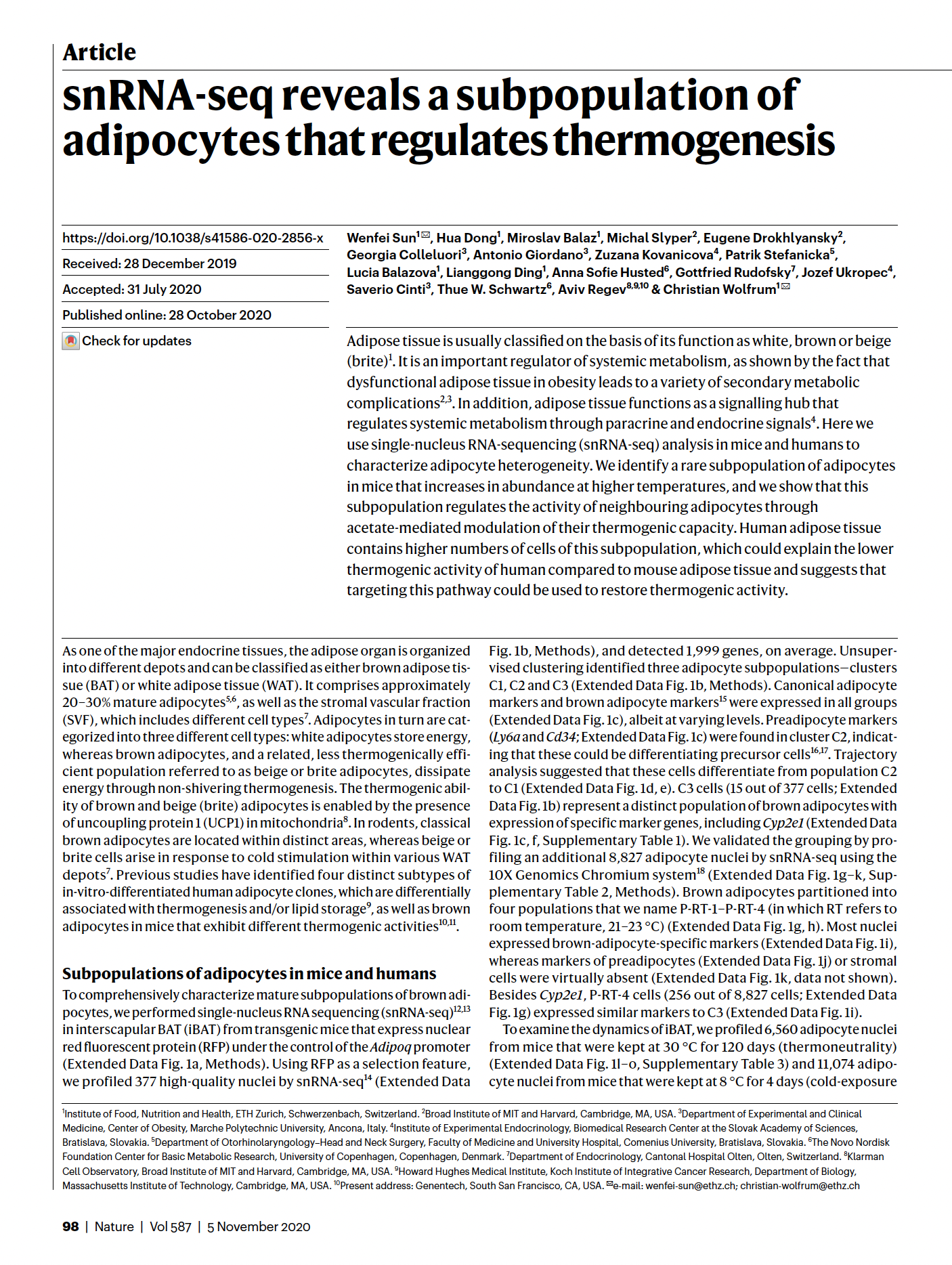 Wenfei Sun †, Hua Dong, Miroslav Balaz, Michal Slyper, Eugene Drokhlyansky, Georgia Colleluori, Antonio Giordano, Zuzana Kovanicova, Patrik Stefanicka, Lucia Balazova, Lianggong Ding, Anna Sofie Husted, Gottfried Rudofsky, Jozef Ukropec, Saverio Cinti, Thue Schwartz, Aviv Regev, Christian Wolfrum †